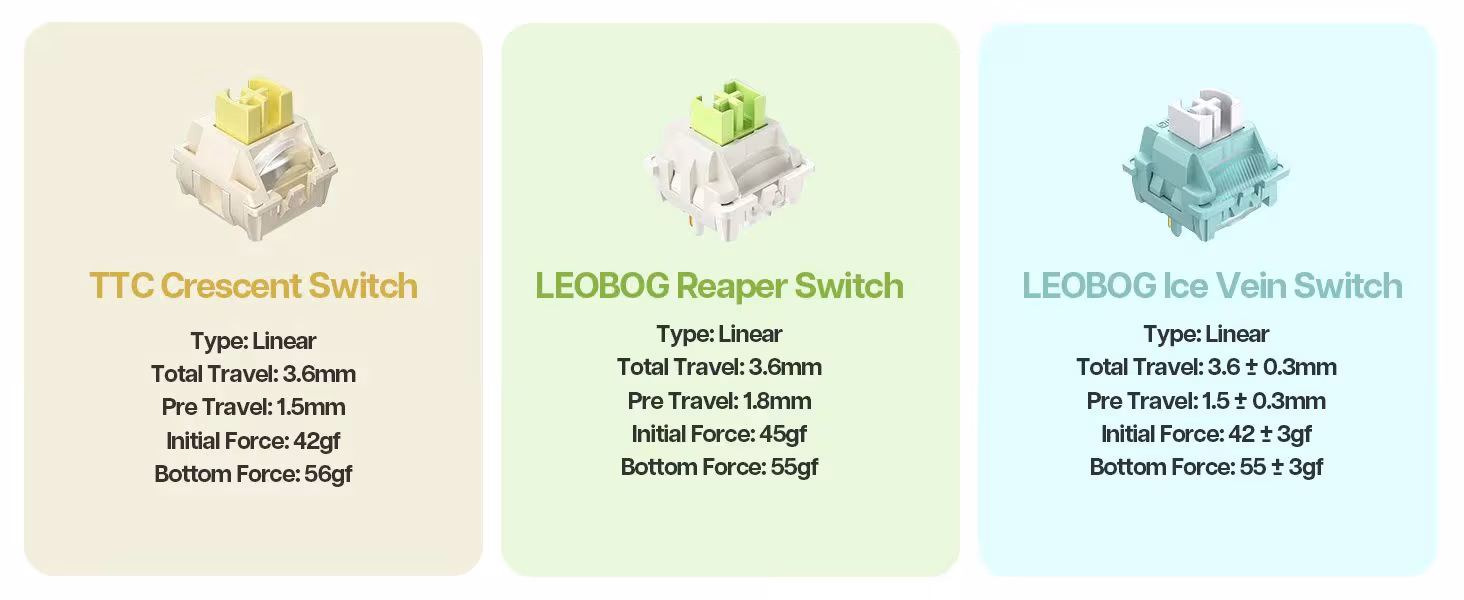 It comes pre-installed with LEOBOG linear switches, known for their smooth feel and quiet operation:
